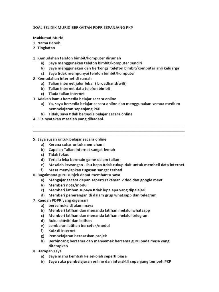 Soal Selidik Murid Berkaitan Pdpr Sepanjang Pkp Pdf